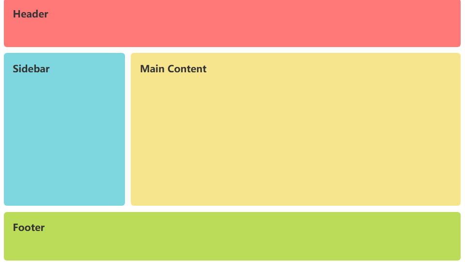 .container { display: grid; grid-template-areas: "header header" "sidebar main" "footer footer"; grid-template-columns: 200px 1fr; grid-template-rows: 80px 1fr 80px; height: 100vh; gap: 10px; padding: 10px; box-sizing: border-box; } .header { grid-area: header; background-color: #ff7979; }
