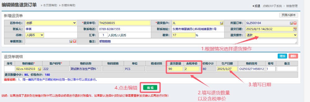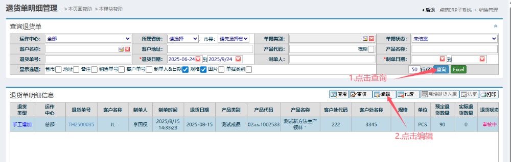 | 点晴模切ERP-编辑销售退货单-操作流程