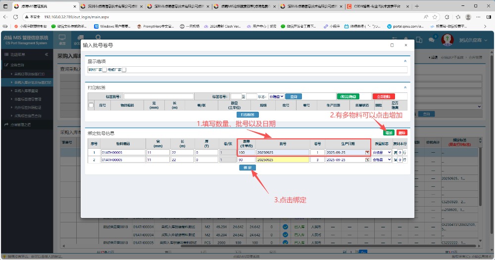 在弹出的信息窗口内,填写数量和日期。如果有多物料的话可以在右边点击增加,然后点击绑定。