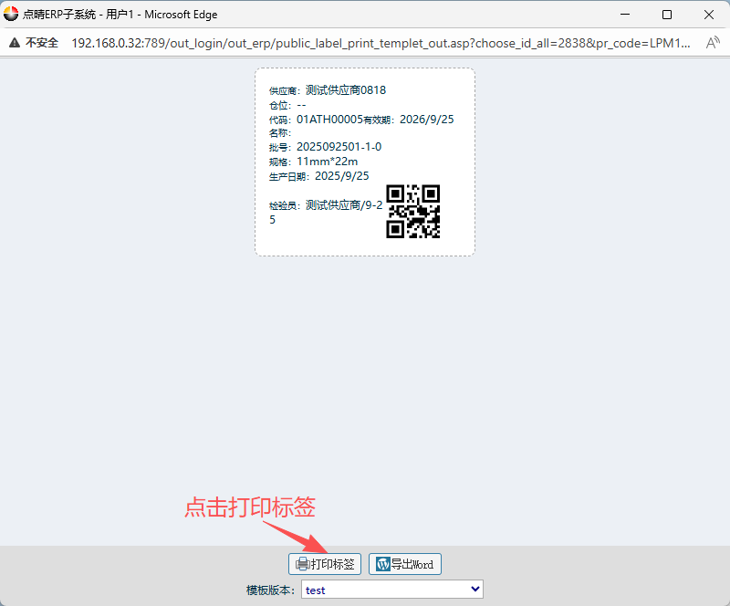 7.在二维码标签界面内,模板选择“test”,点击打印标签。然后就会弹出打印预览界面。
