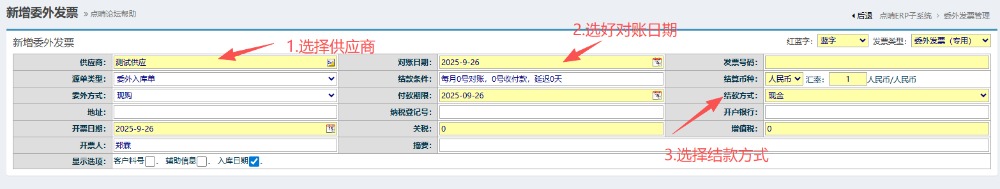 2.进入界面后,按图操作:先选择供应商,填好对账日期以及选好结款方式。