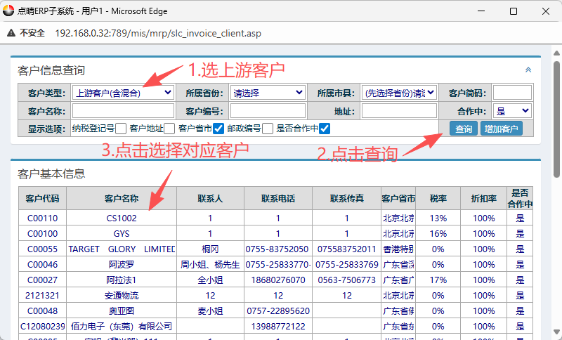 点击供应商后会弹出客户信息窗口界面,按图操作:选上游客户,点击查询。然后点击选择对应的客户。