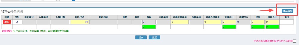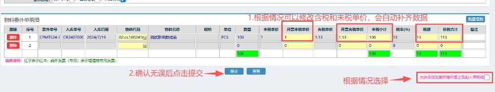 4.选好对应发票明细后,可以根据情况修改含税和未税的单价,确认无误后点击提交。 注:可以根据情况选择右下方“允许添加发票所属月度之后的入库明细”