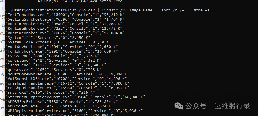 tasklist /fo csv | findstr /v "Image Name" | sort /r /+5 | more +1