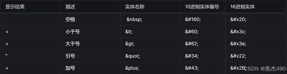 在 HTML 中,某些字符是预留的,例如在 HTML 中不能使用小于号<和大于号>,这是因为浏览器会误认为它们是标签。 如果希望正确地显示预留字符,我们必须在HTML源代码中使用字符实体(character entities)。 HTML 中的常用字符实体是不间断空格。(注意:实体名称对大小写敏感!) 字符实体类似这样:&entity_name; 或者 &#entity_number;如需显示小于号,我们必须这样写:< 或 < 常见的实体编码: