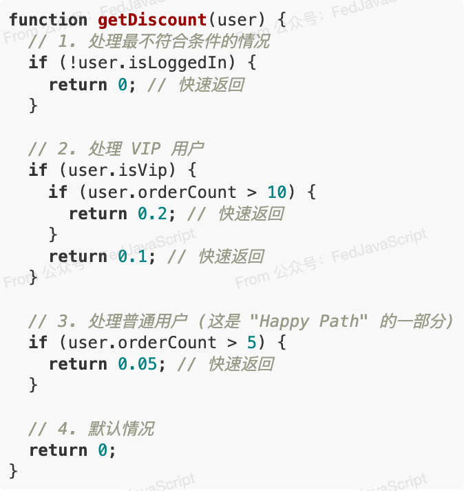 这种模式的指导思想是:在函数的开头,优先处理所有的异常、边缘或无效情况,并立即返回。 这样,函数的主体部分就可以专注于处理“快乐路径(Happy Path)”,即最核心、最正常的逻辑。