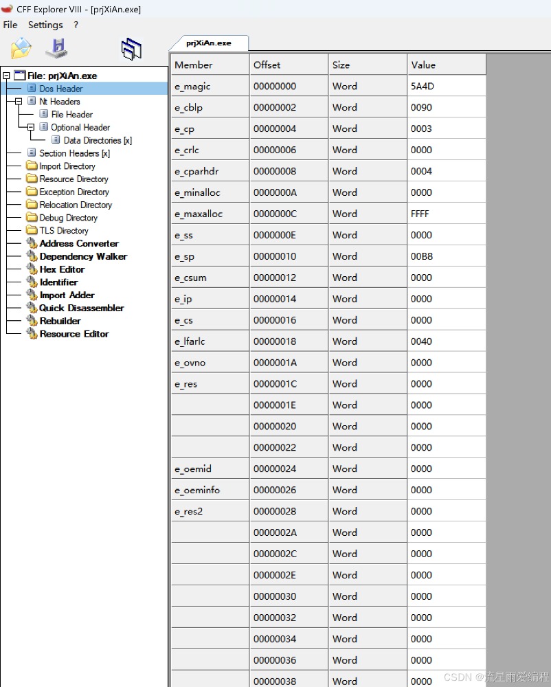 启动 CFF Explorer 后,主界面左侧是一个树形导航栏,右侧是详细的十六进制和结构视图。