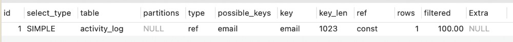 mysql> EXPLAIN SELECT * FROM activity_log WHERE email = 'little.bobby@tables.com';