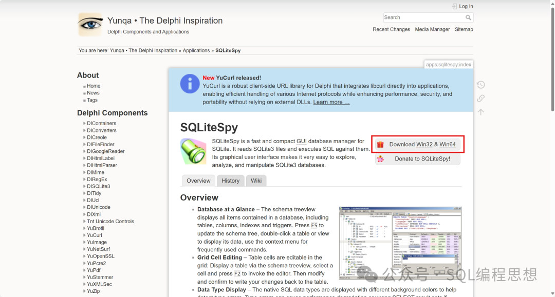 点击页面“Download Win32 & Win64”进行下载,完成之后解压即可使用,推荐运行 win64 目录下的 SQLiteSpy.exe: