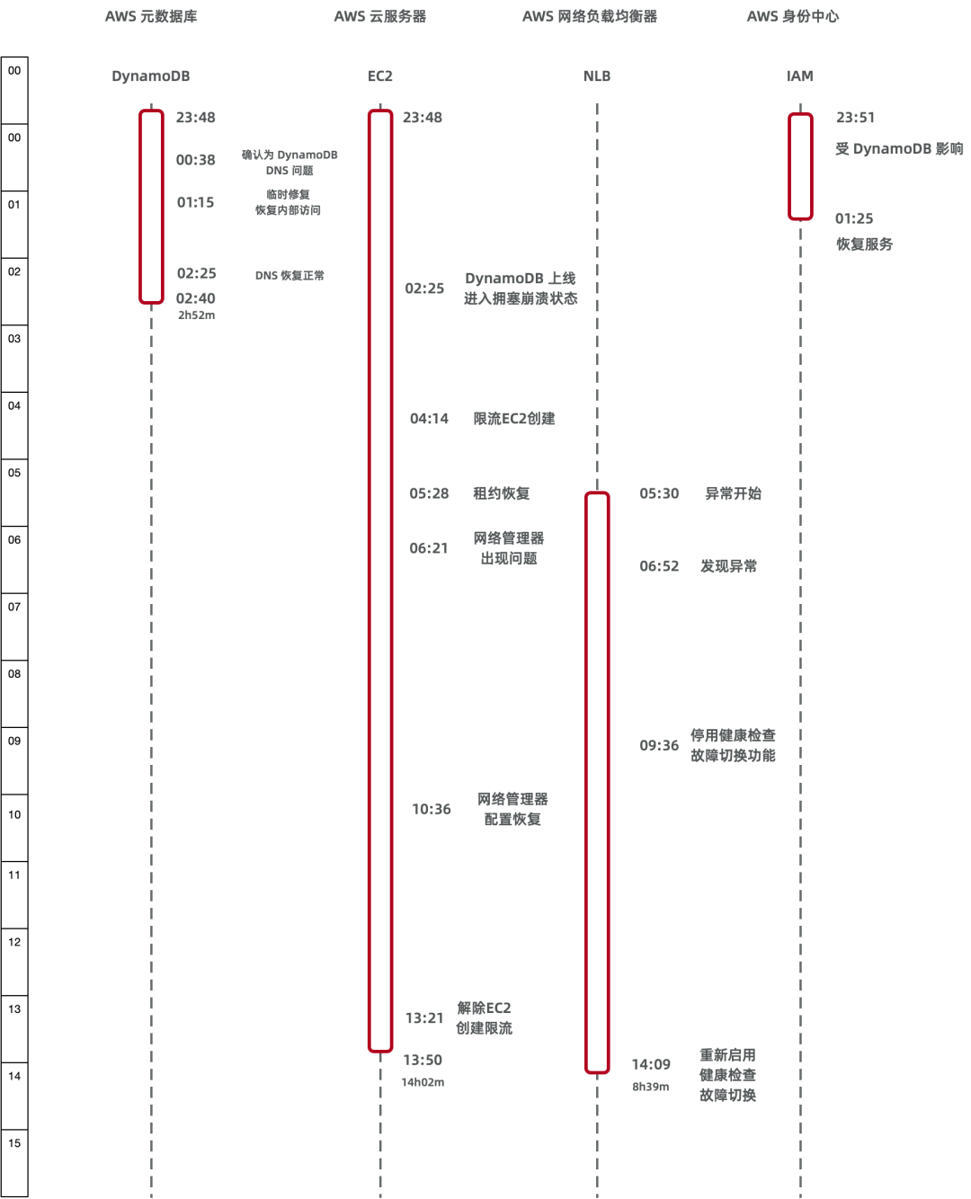 我们希望就2025年10月19日至20日发生在美国东部弗吉尼亚北部(us-east-1)区域的服务中断事件向您提供一些补充信息。此次事件始于10月19日 PDT23:48,结束于10月20日 PDT14:20。在此过程中,客户应用的影响大致可分为三个不同阶段:
